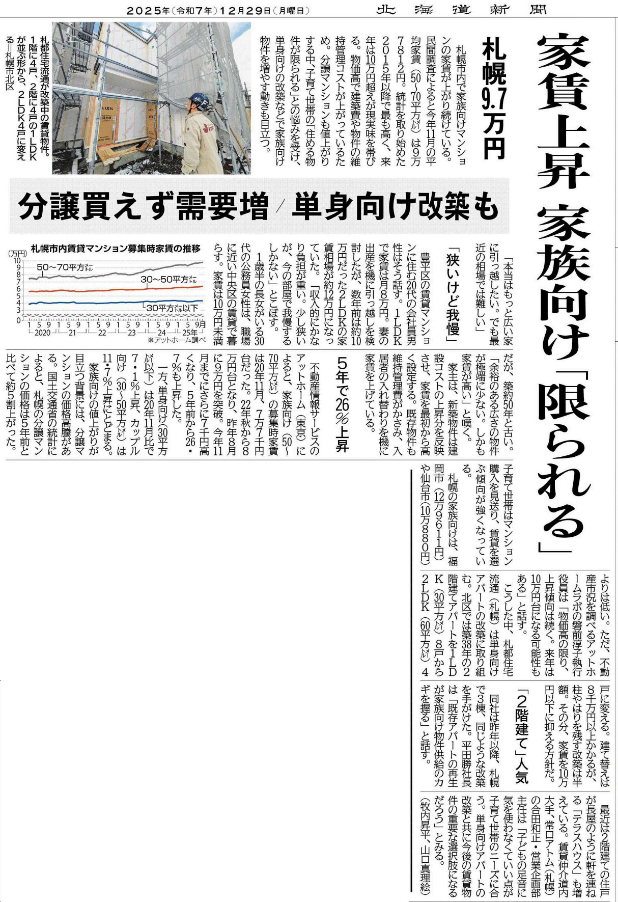 ファミリー向けの賃貸住宅の家賃が上昇☹